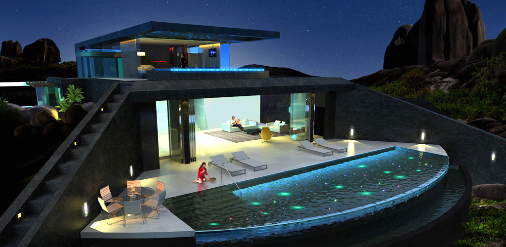 Még a jóga pavilon és a vizes területek sem épületekben találhatóak, hanem a sziklák tetejére épültek a buja növények közé, a végtelenített medence pedig egyedülálló kilátást nyújt a tengerre.