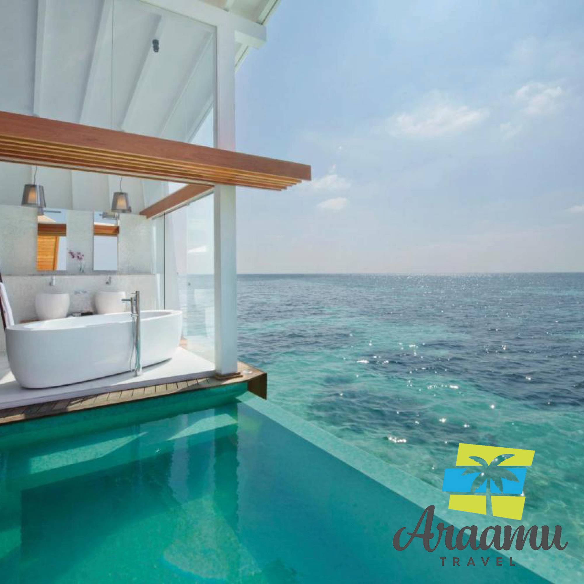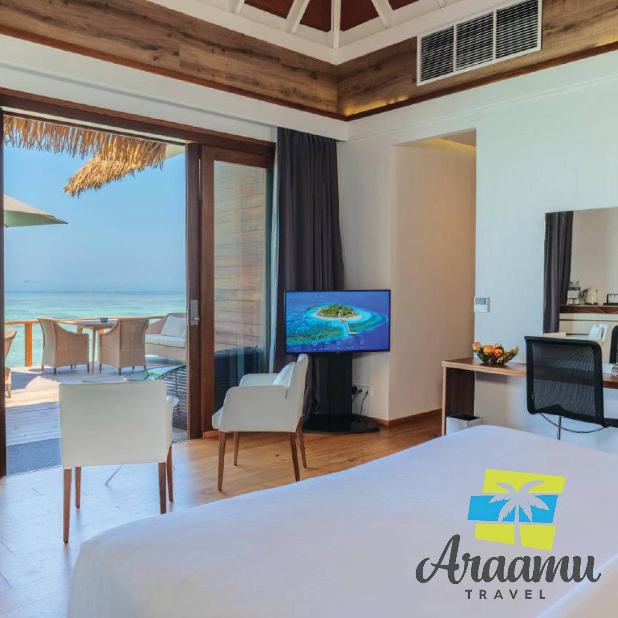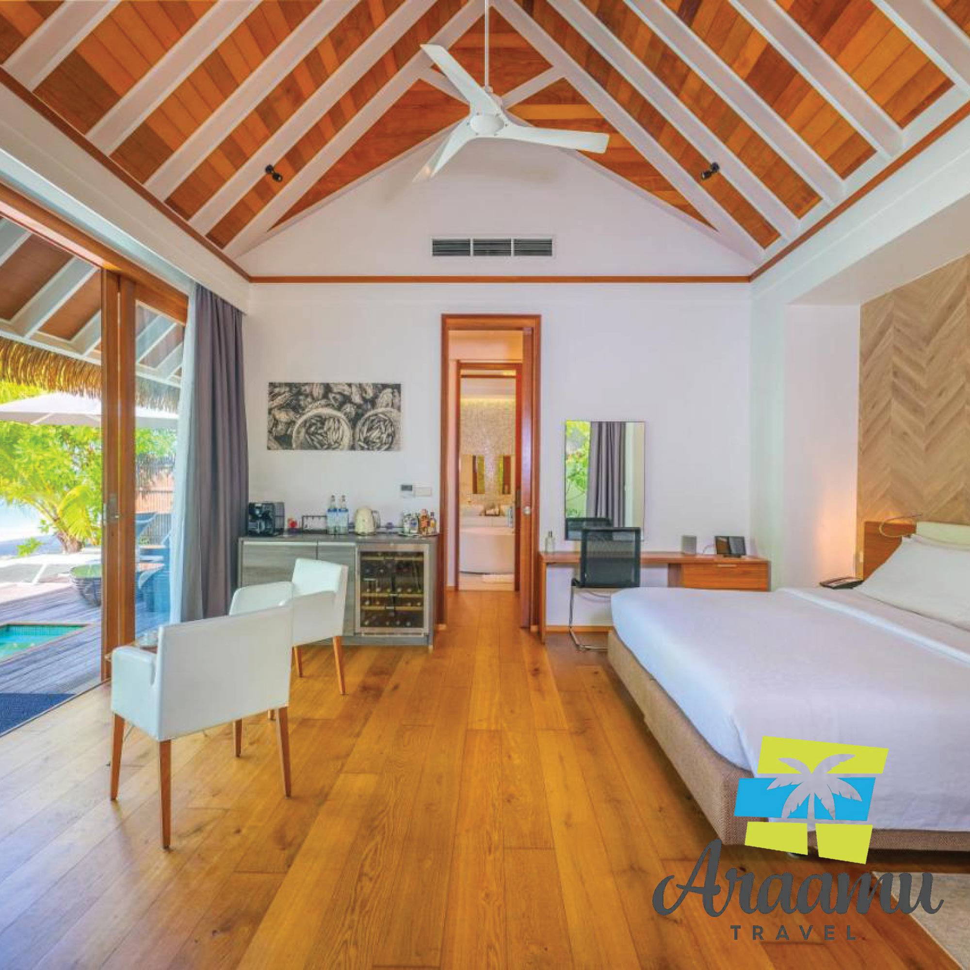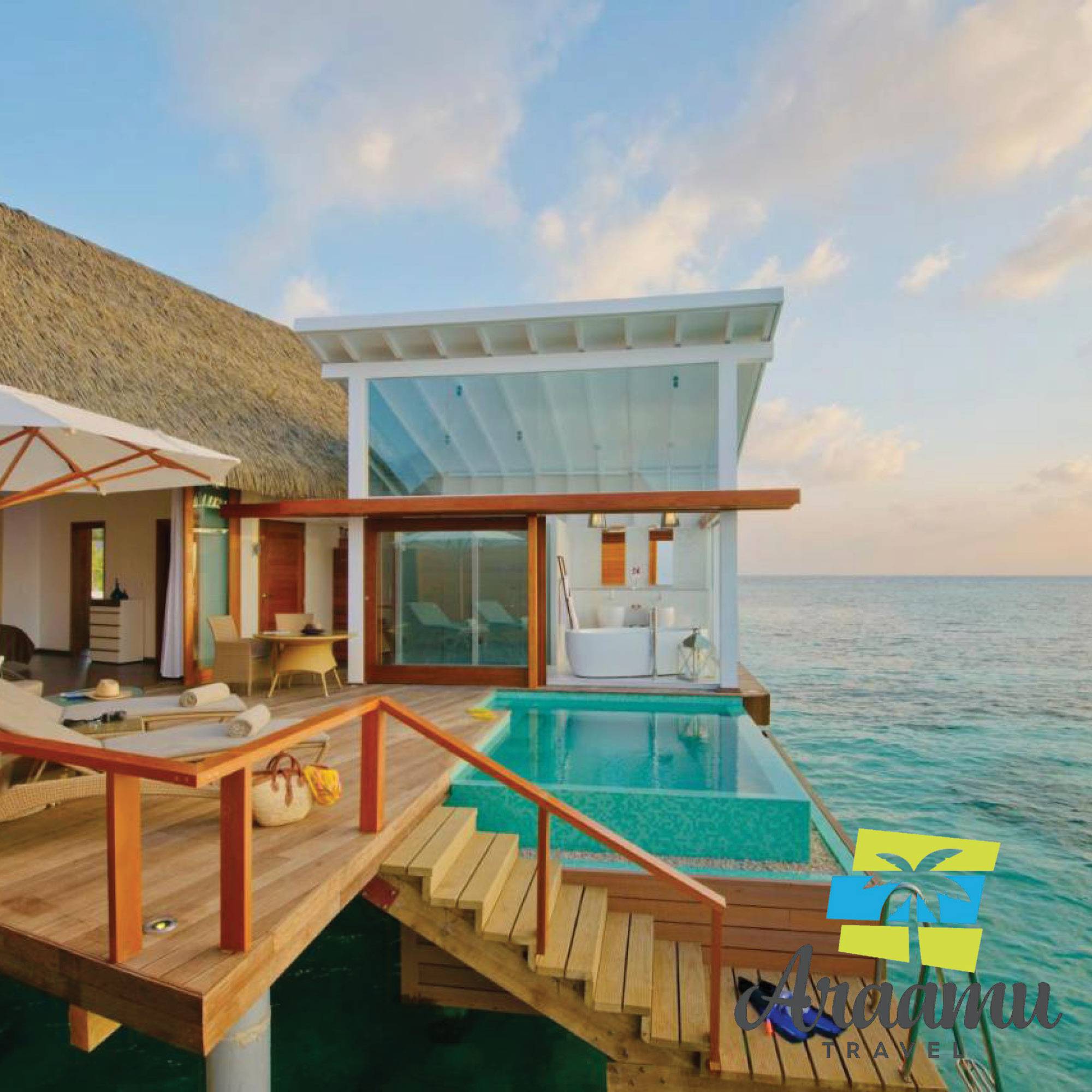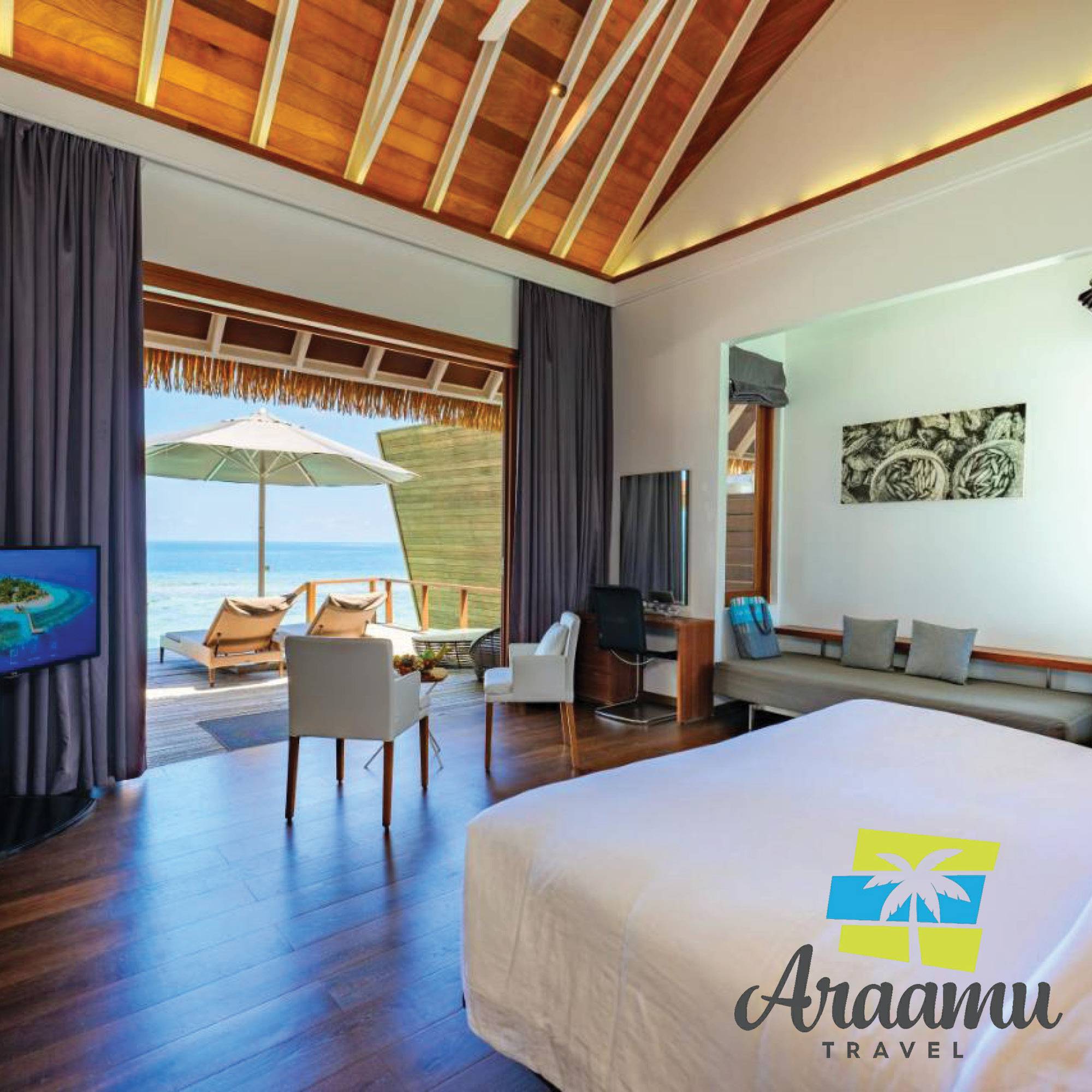 Water Suite: kb. 90 nm (4), a Standard Bungalow-hoz hasonló, a víz felett cölöpökre épült, különálló. Stílusosan, kézi megmunkálású tikfabútorokkal berendezett. Nagy fürdőszobás, plusz jakuzzis kádas, a lagúnára való kilátással. Privát napozóterasszal a tengerhez való közvetlen lejáróval, a naplemente irányában.