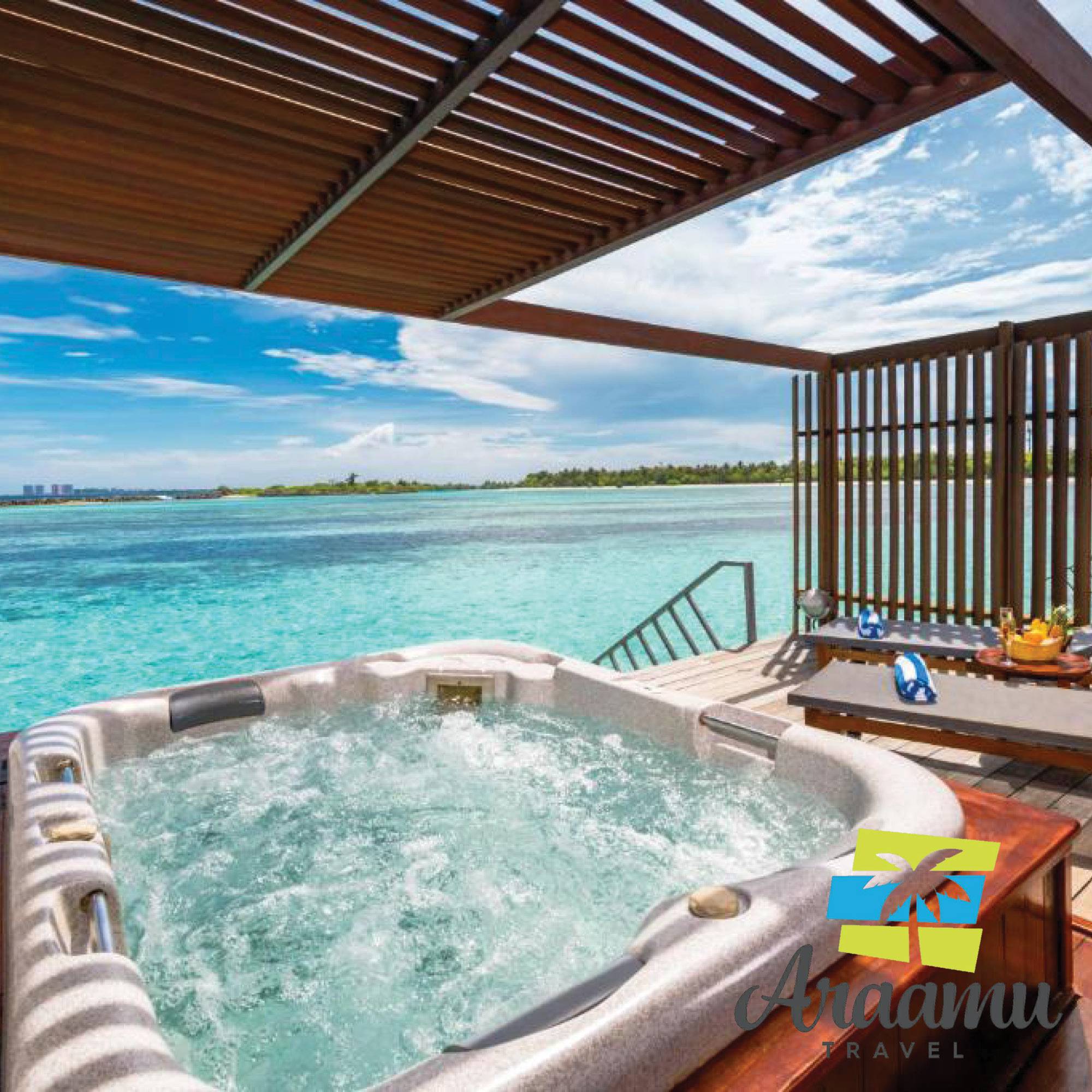 Water villa jakuzzival: 81-90 nm, vízi villa (cölöpökön a lagúna felett, ikerház), tengerre néző, zuhanyzó, WC, fürdőköpeny, hajszárító, légkondicionáló, ventilátor, minibár térítés ellenében, széf, TV, WiFi, vízforraló , presszógép, kávé/tea, terasz (bútorozva), közvetlen lejárat a tengerbe, pezsgőfürdő.